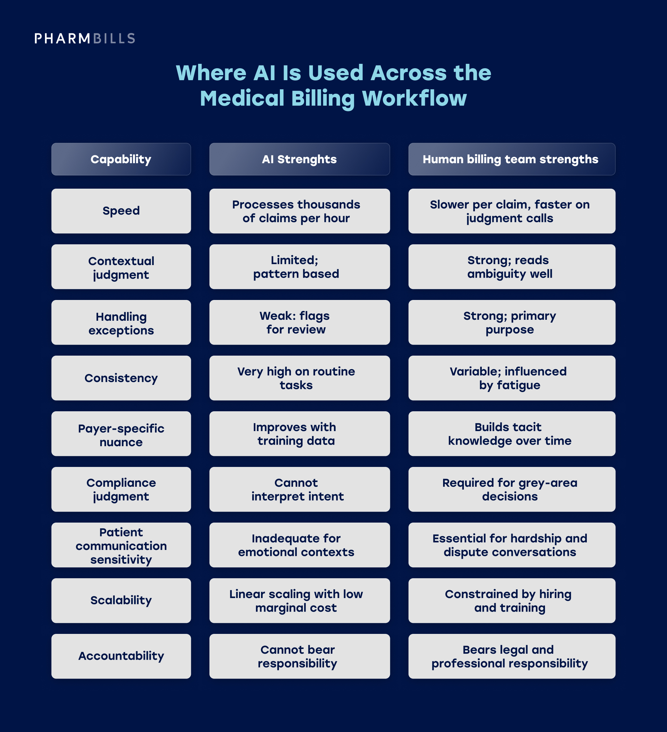 The most useful framing for AI systems in medical billing and coding is not "AI vs humans." It is "what does each do best, and how do they combine?" The comparison below outlines where each approach has structural strengths.