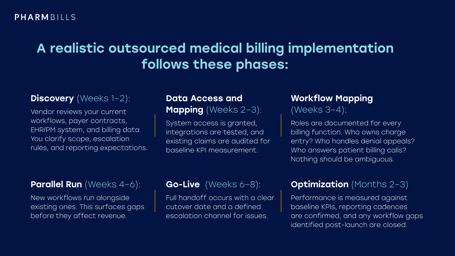 A realistic outsourced medical billing implementation follows these phases: